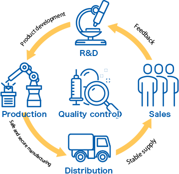 JMS provides a wide range of solutions, from the field of infusion/transfusion to the fields of infusion/nutrition, dialysis, surgical treatment, and blood/cells. One of our key focuses is standardization. This is a process of improvement to build a system to ensure safe medical activities in medical care settings where no errors should occur. Another important focus is efficiency. Our solutions to reduce burdens on staff in complex medical care settings contribute to the maintenance of high-quality medical care.